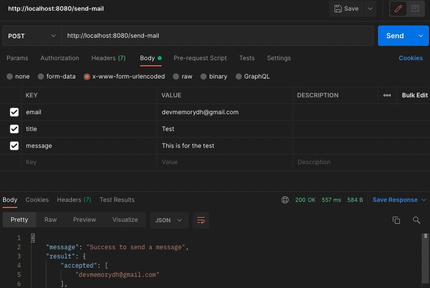 /send-mail에 req.body에는 이메일 주소, 제목, 메시지(email, title, message)가 들어가고