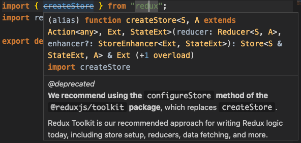 밑에 내용을 확인해보니 redux toolkit에 있는 configureStore로 하라고 해서 사용법을 찾아봤습니다